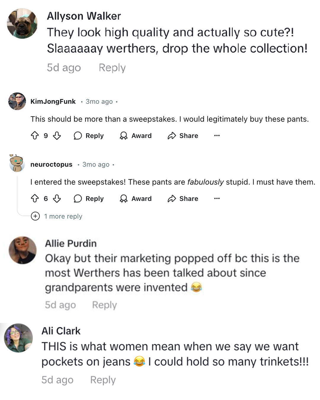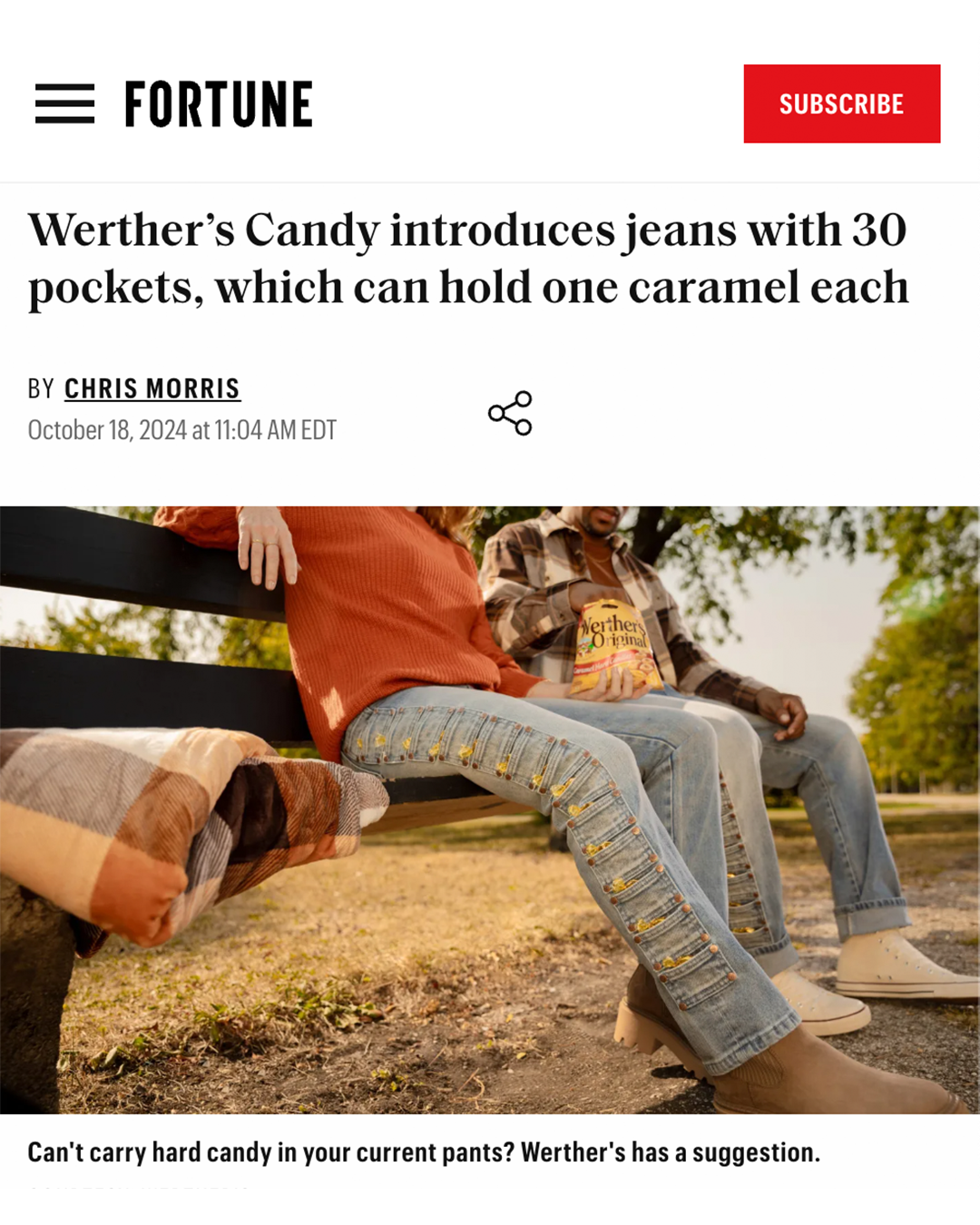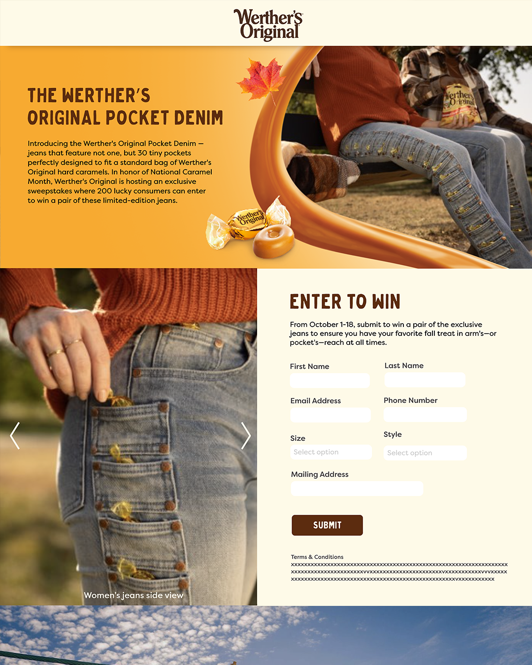 You know that mysterious tiny pocket in your jeans? Did you know that it's actually the *perfect* size to hold a Werther's Original candy? Because nothing screams fall quite like a good denim pant with pockets full of caramel, we created custom jeans with 30 tiny pockets—each perfectly sized for Werther’s—so you can carry the Official Flavor of Fall with you everywhere. Now known colloquially as 'the Jerthers,' this PR-led sweepstakes campaign blew our expectations out of the water, earning 392M impressions, 92K site visits, and a 61% higher engagement rate than projected.